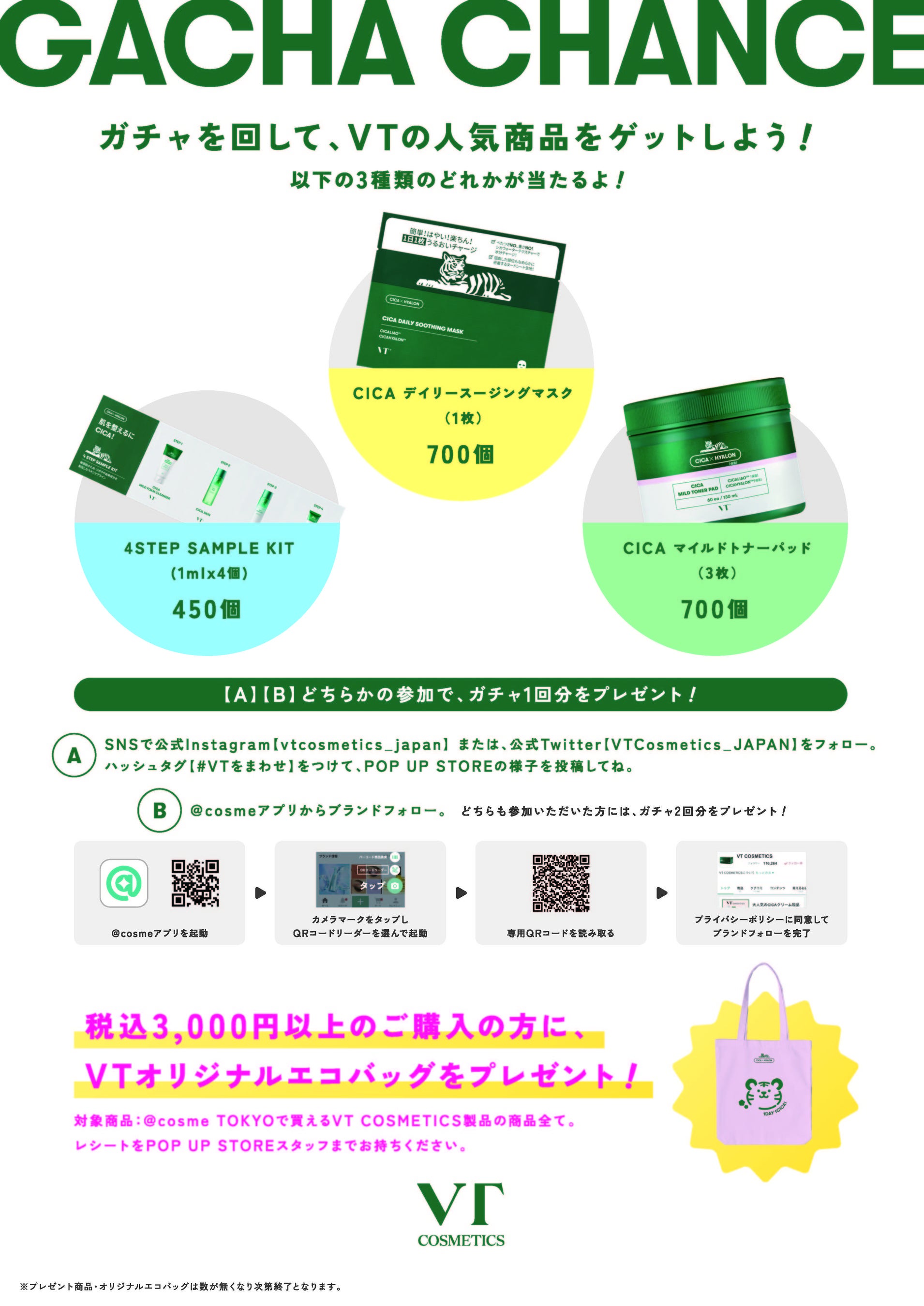 VT公式SNS(InstagramまたはTwitter)アカウントのフォローとハッシュタグ「#VTをまわせ」をつけて、ご自身のSNS(InstagramまたはTwitter)上にポップアップストアの様子を投稿していただいた方、または@cosmeアプリから、ブランドフォローいただいた方にその場でガチャ1回分をプレゼント。どちらも参加いただいた方には、ガチャ2回分をプレゼントいたします。